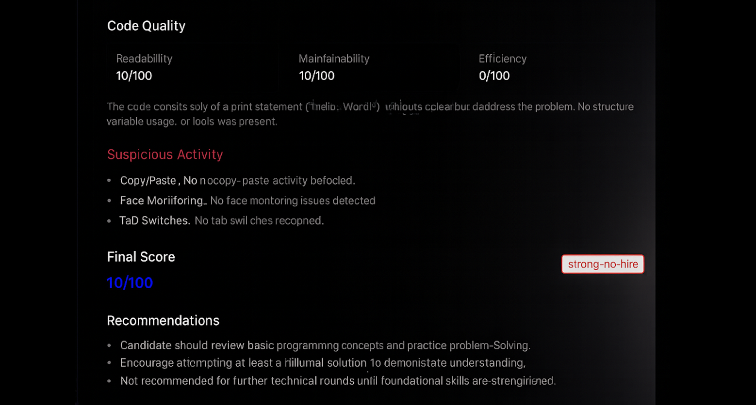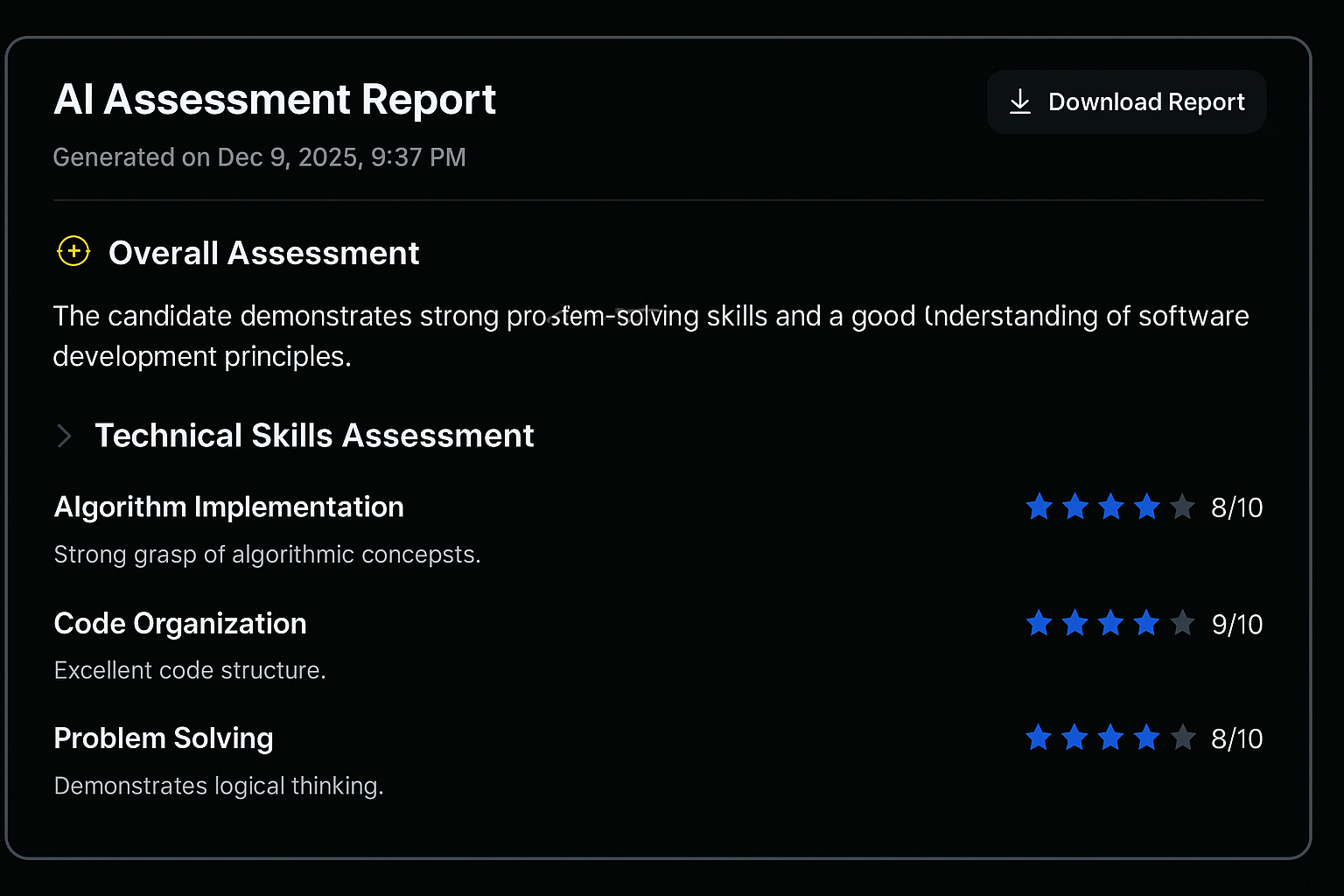 Deviation Score updates live as candidates work, revealing their approach, iterations, and reliance on AI.