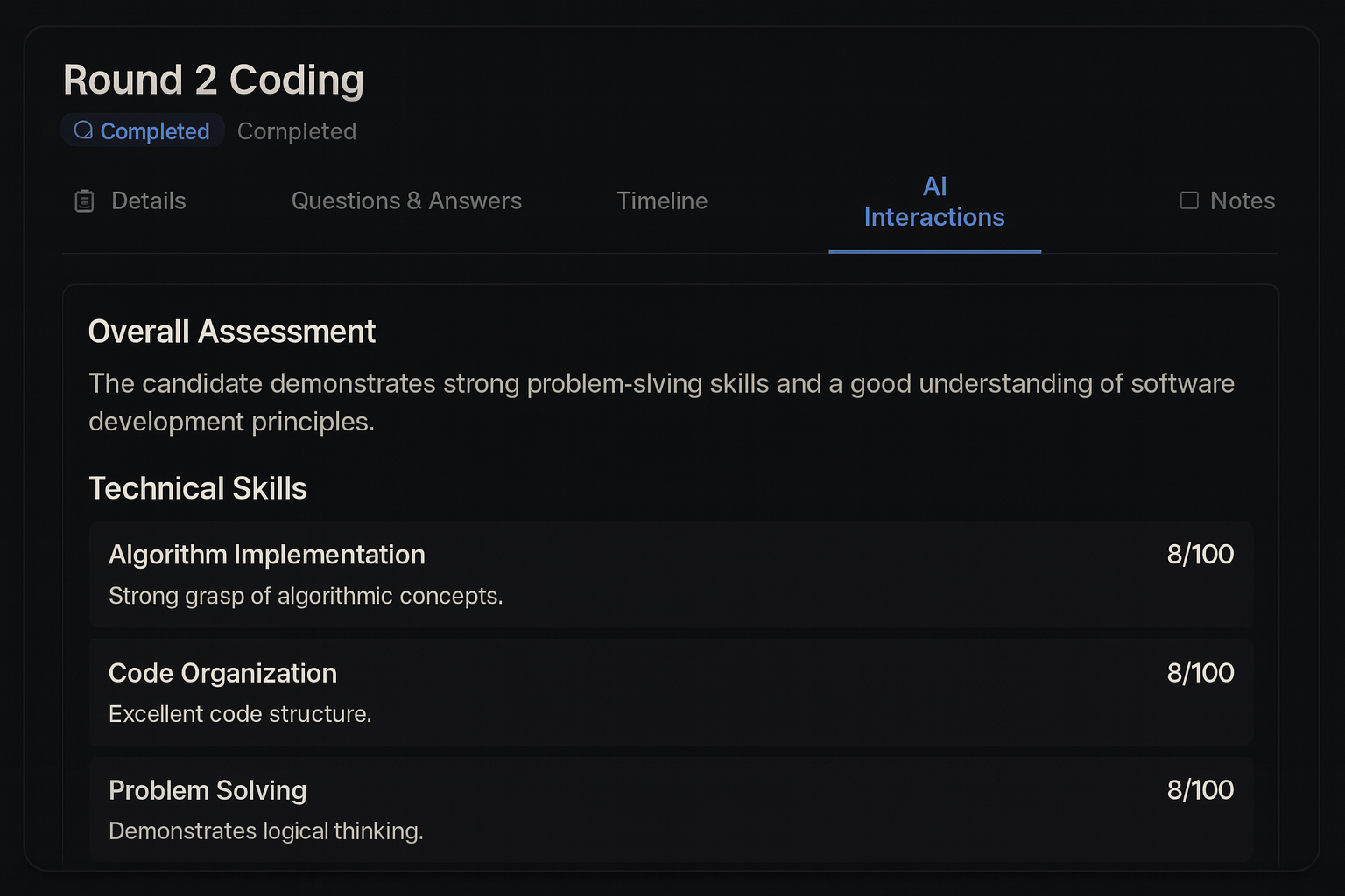 Every prompt and response is tracked so you can see the candidate's thinking process.