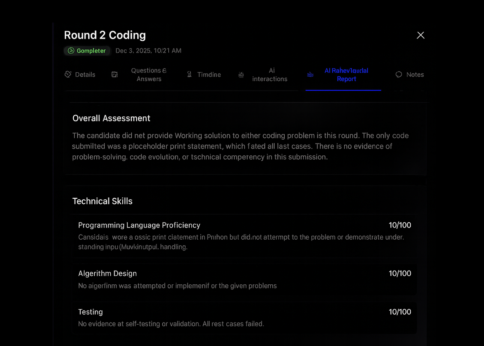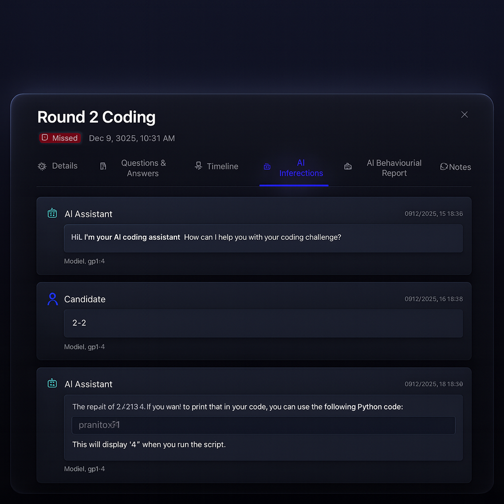 All insights-prompt logs, judgment events, plagiarism checks, and test results-merged into one report for faster shortlisting.
