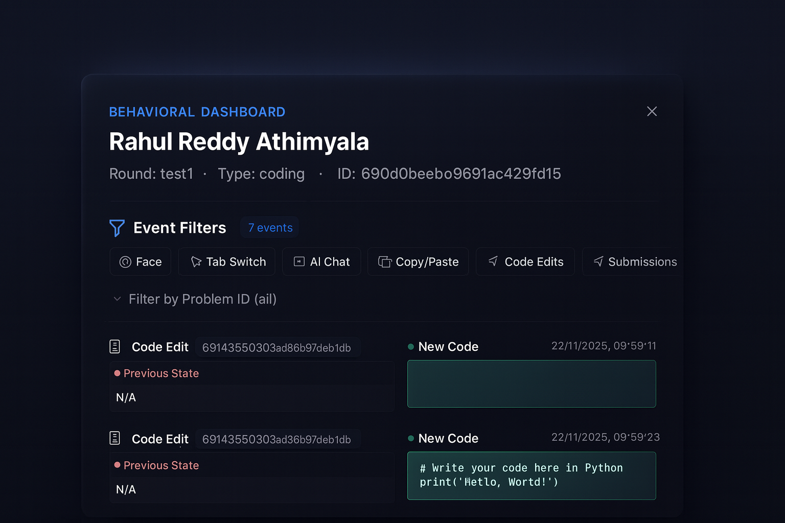 Go beyond code - analyze typing speed, edits, and pause patterns to detect suspicious activity.
