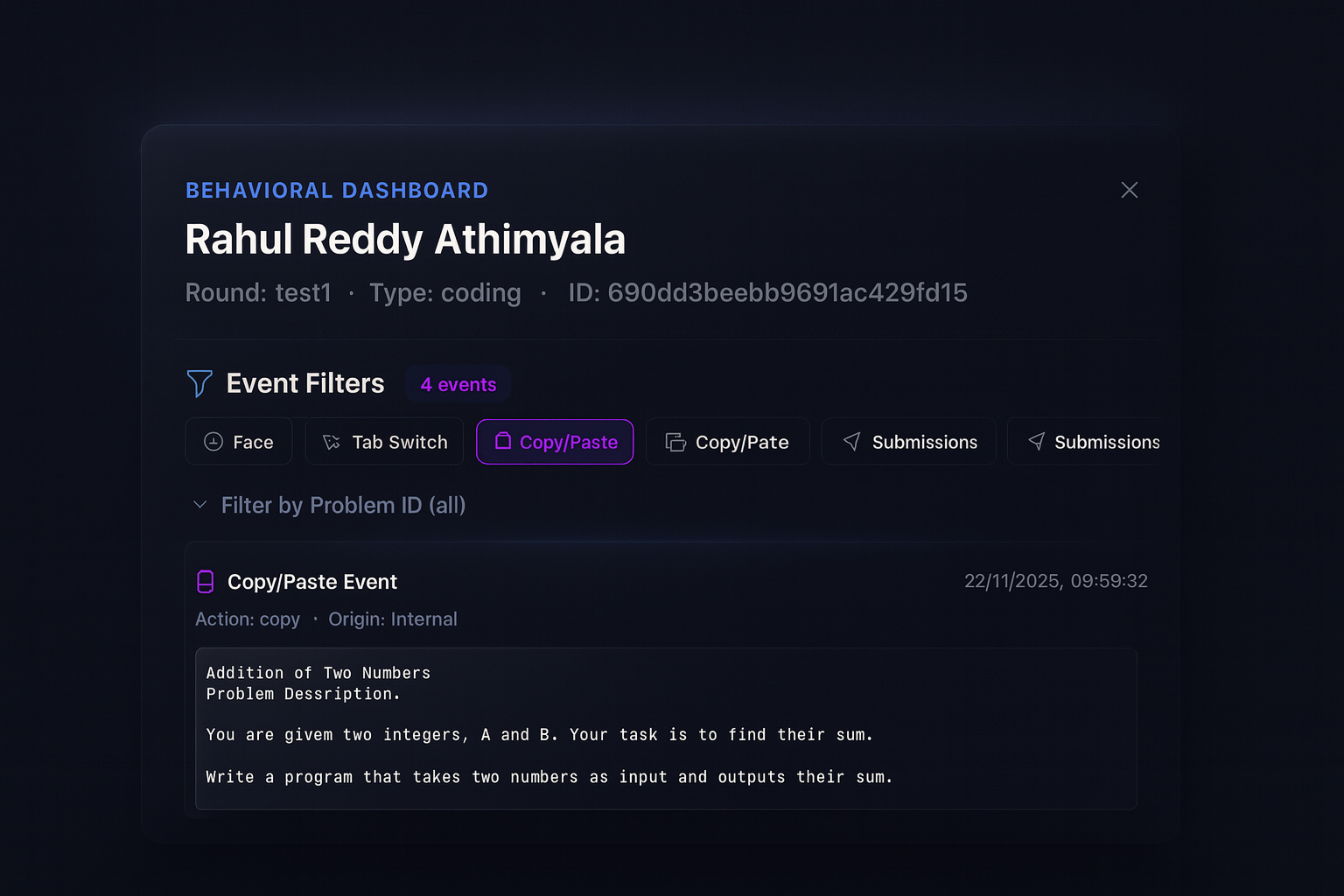 Detects pasted code instantly, preserving the authenticity of candidate submissions.